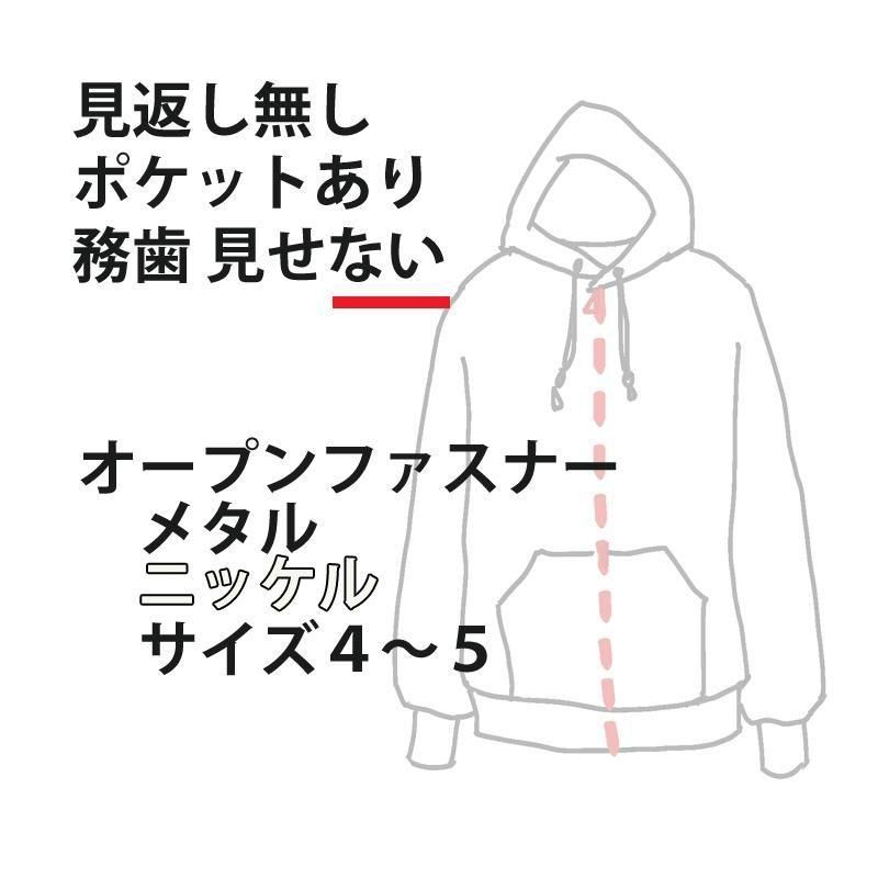 パーカーのジップアップリメイク(ポケットあり・見返し無し・務歯見せない・オープンファスナー:ニッケル・サイズ4〜5)