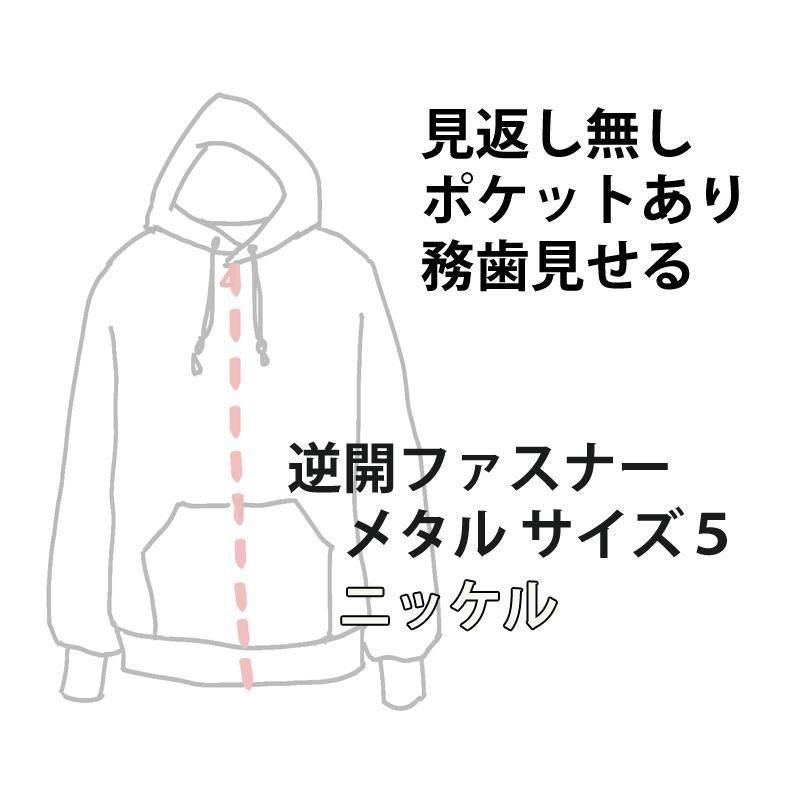 パーカーのジップアップリメイク(ポケットあり・見返し無し・務歯見せる・逆開ファスナー:ニッケル・サイズ5)